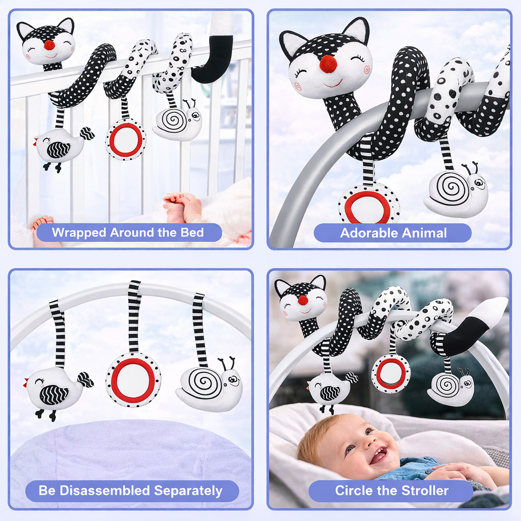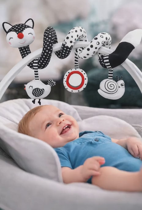 Support your baby's early development with this multi activity stroller and car seat toy. Features high contrast black and white colors that help stimulate your baby's developing vision. With three engaging hanging toys for visual tracking, auditory awareness, and early interaction.